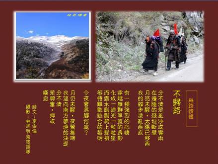 《絲路情懷》不歸路 分不清是風沙或雲雨 在邊陲的殘垣斷壁 月亮未醒,太陽已移西 我的腳步凌亂疾疾 有一種強烈的心情 穿越雁群筆直的身影 化成一道光一粒粒星 而露水剛剛爬上髮梢 等待離歡結合的黎明 今夜會落腳何處? 月仍未醒,夜鶯無啼 我望向南方夢境的決堤 分不清 是興奮,抑或 嘆息 詩文:李宗倫 攝影:林旭明-飛哥領隊 2015.3.11