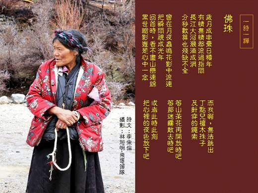 《一詩一禪》佛 珠 歲月成串纍日積年 有情無情都流過指間 長江大河濺滴成涓 分秒數算也殘缺不全 曾在月夜蟲鳴花影中流連 把瞬間視成光年 回首時,看不盡山巒連綿 累世縮影豈是心中一念 而我啊,無法跳出 丁點兒檀木珠子 及針穿的繩索 等山茶花再開放時吧 等那迷霧散去時吧 或者此時此刻 把心裡的夜色放下吧 詩文:李宗倫 攝影:林旭明-飛哥領隊