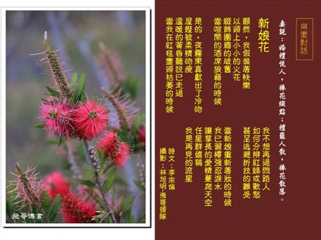 妻說:婚禮悅人,捧花綴點;禮罷人散,捧花散落。 顯然,我假裝著快樂 以頭上小小的火花 綴飾圍牆的破舊 當喧鬧的酒席狼藉的時候 是的,夜霧果真獻出了冷吻 屋燈被柔情吻瘦 溫暖的黃昏聽說已走過 當我在紅毯盡頭枯萎的時候 我不想再過問路人 如何分辨紅綠或歡愁 甚至逃避折技的難受 當新娘重新著妝的時候 我已習慣強忍淚水 讓孳長的愛情蔓爬天空 任星群嬉稱 我是再見的流星 詩文:李宗倫 攝影:林旭明-飛哥領隊