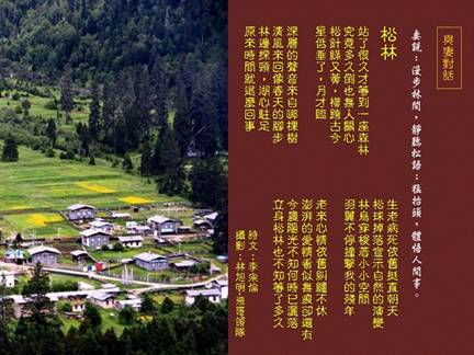 《與妻對話》松林 (妻說:漫步林間,靜聽松語;猛抬頭,體悟人間事。)