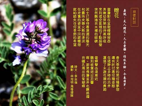 《與妻對話》贈花 (妻說:友人贈花,久未愛顧,枯枝年餘,今春萌芽。)