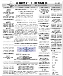 2009年也是俺的詩作發表分布最廣的一年。除美國《僑報》、《華夏文摘》、《文訊》、《美華文學》外、俺的文還被推薦到《星島日報》、《世界日報》、《澳洲新報》、《澳洲彩虹鸚》、《藍》、《黃河詩報》、《香港文學》、《新大陸》、《長春藤》等報刊。從美國到中國,從港台到東南亞,又到澳洲,可以說是月月都有發表作品的好消息,不斷收到寄來載有俺作品的報刊。對於作者本人來講,每件作品都是自個生的寶寶,寶寶被刊用,就跟中彩票一樣叫人高興。在此,俺從心裡感謝所有的伯樂和編輯們,一想起他們就讓俺感到有一股春風拂來。