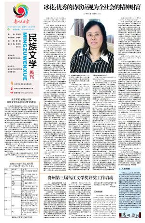 冰花專訪: 優秀的詩歌應視為全社會的精神財富 文/特約記者 郭紫琪(漢族) 2012年03月16日,星期五 貴州民族報 民族文學周刊, 2012年3月16日 http://blog.sina.com.cn/s/blog_4a6b7d2c0102dyl5.html