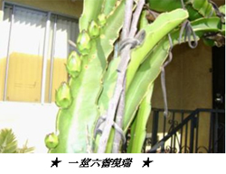 我依她的指劃,搭了一個簡單木架,牽引龍果莖籐爬上,一年之後,節中生芽芽外長棘,節芽互長,茁壯非常,生長強勁,節節延伸,二年後火龍果枝四處蔓延,蓋天垂地。三年後最茂盛,試花結果,長時果皮青青,熟時果肉紫紅,開花時有唯我獨尊之態。它容易整理,沒有落葉之煩,更不須天天澆水之苦。葉莖不分,聽說其莖吸入垢氣