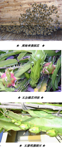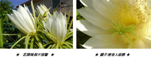 排放淨氧,對家居環境有益,是否屬實,要問植物專員了。一年六月到十月時,連續開花結果三趟,常在早上六點開花,九點開始萎謝,火龍花一現,蝶搶蜂爭,繞在蕊心採蜜,瓣蒂擔花。火龍果大若橙果,肉淡味甜,清涼解毒,對腸胃特別有益,外皮艷紅,內肉青紫,有不同品種,貯放時間長,越華人士喜用供奉神明。吃之有味,看之有姿,易於整理,因此,我家前後能種之地都種滿了。 莖莖菡苞,節節長果,有時一枝莖,同出五蕾苞,見者羨慕不已,問我用什麼肥料?怎樣種植?其實,我也不知道!也沒心研究,我是無心插柳柳成蔭的人,這年來,我只知道澆水摘果而已。最玄的是,我太座有位朋友聽聞也想來取果種回去種,自稱是火龍果專家,既是專家,何須我動手幫忙,我遞給她一把樹剪,隨便剪取,她昂然到果棚,東挑挑,西揀揀,上看下翻,左選右擇,老是剪不到幾枝,我在遲疑,嫩嫩玉手,是否被果棘朿傷了?太座給我一個眼色,示意我去幫忙,接過剪,我問要那枝?她即拿出簡便放大鏡,衹細視察觀照,在做功課,她指那枝,我剪那莖,她所要果種如數剪紮,過後,我不解,問她有可區分?她說:三棘為雄,四棘為雌,雌雄合種,果結滿棚。我險些站不隱,啼笑皆非,次之嗤之以鼻,真是山寨專家,三八亂言,不敢恭維,不足為信!植木一種,那有雌雄之分!址得太遠了。幾年來,我種植經驗只有四要:一陽光,二水份,三土壤,四種籽,四要具齊,開地種植,等待時日,準備採摘,臺前享用,安心健康。
