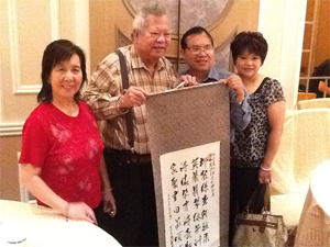 這次茶聚,體現最熱忱的還是樸魯詩長,大方攜眷出席,可見其對潘統的尊崇與重視,席間,暢談過去,展望風笛遠景,搞笑風趣,帶起場中氣氛。命理師楊國枝大談五行制衡,四時運氣。楊永超詩長詩情奔放,口沾清茶,心情開朗,快筆直書,書了嵌名賀聯一款,寫意非常,他知道今天潘統會幫他查看電腦,收不到信息使他惱了數周,今日得以解决。劉姚朗詩長德高望重,詩情豪放,見識廣濶,人善謙和,能夠請他到來,公關做了大量工作。前些日子,他曾送我一本『明軒詩鈔』,詩鈔製作精美,今天有機會見到他,當然要爭取時間與他合影留念,沾沾他的光環也。
