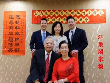 看看他倆成績:庭園種樹,桂植二棵,桑榆並茂。堦前培花,蘭栽在一盆,獨枝長榮。女兒江麗芬(Helen) 兒子江嘉豪(Terry),江嘉偉(David)三姐弟,學有所長,在外勤奮工作,今日回家聚合圍繞身邊,獻上鮮花,為雙親祝賀,多麼美好的一幅溫馨閤家歡。
