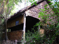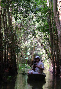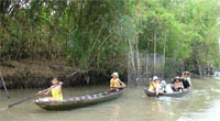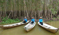 到此徒步或坐舟均可,但多數人都選擇乘舟。旅遊公司也給我們安排乘坐小舟。這裡的“舟夫”全都是女的,她們都穿同一套全黑色的制服,脖子上圍著小格子圍巾。這裡兩岸都是長滿千層樹,據說已逾四十年壽命了,而且有很多樹身都很粗大,這是我第一次看到的。樹叢蔭蔭濕濕,周圍一片靜寂得令人膽寒;沿途中也會看見有一兩間茅屋,聽說這是抗戰時期解放軍用來住宿、或用來開會議。我們坐在舟上,看到水上很多飛物,感覺不習慣處在這種環境下,畢竟,真的要佩服當年在這裡從事軍事的解放軍那種不屈不折的精神。