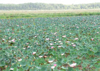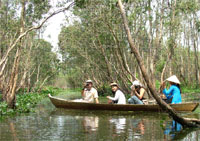 沿河兩岸,長滿許多野花雜草和蘆葦,兩邊還有椰樹、柳樹、白騰樹、青竹等不知名的樹高高站在兩岸邊。有的椰樹伸出身子,好奇探頭看我們路過;有的青竹伸出手來,撫摸著河水;也有的彎下腰子鞠躬,似乎歡迎我們光臨……太約30分鐘,我們來到了一個蓮潭。 船停下,我們走上岸去,方發覺一片一片茫茫無際的蓮潭,潭裡蓮花成千上萬,粉紅嬌人的蓮花,碧綠青翠的蓮葉,還有蓮蓬,我們各自都不停拍攝起來。在蓮潭遙遠的邊緣是一畝畝綠油油的稻田,多麼怡人的一片景色。這裡只有兩戶小人家,那條狗兒遠遠看見我們已吠個不停。這裡是有小塔梅的美稱,頓時令我想起“塔梅最美是蓮花,越南最美是胡志明名字。”我感到萬分自豪當我們是來自胡志明市。