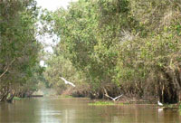 舟一路駛向前,看見兩邊樹上遠遠棲著或鶴或鷺等,我們準備相機攝獵牠們時,舟未划近,還在很遠的距離,牠們卻展翅飛走了,有的從樹叢裡飛去,遠遠劃過我的瞳仁,相機也來不及攝獵。