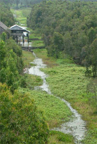舟從寬大的河面拐進一條流,河就漸漸狹窄起來。兩邊除了那些千層樹,水面浮著許多碧綠的浮萍,也有不少蜻蜓,高高低低飛著。平時在市區,我們看到的蜻蜓只是黑色或橙色或紅色,可是,這裡的蜻蜓是黑色,那兩片輕盈薄莎似的翅膀繡上黃色的花紋,十分漂亮,牠們在陽光下如一朵朵會飛的蝴蝶蘭一樣,翩躚弄影。有的輕快掠過河面一點水則飛走了,這時可目證到所謂的“蜻蜓點水”了。