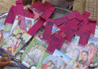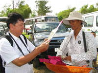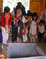 我向當地一個人問及祈福品的意義(右圖:祈福品)。據他說,簿子和筆是代表可以得到攻書教學,尖利的剪刀是象徵我們在學習上取得尖銳的成績,鏡子代表美麗,梳子用來打扮,針線代表衣著豐足;所以祈福品是祈求自己及子女能幸福好運、生得俊俏、豐衣足食及學問卓越。致謝之後,我看見剛才入門迎賓兩男青拿著的傘子和女青們捧著的假花,原來是當僧人到訪時用來在背後遮住僧人走到會場,還見有五個穿著奇異怪服及帶著恐佈的面具,敲鼓打鑼;我擱置的疑問找到答案了。而每廟前來的僧人都派代表上臺發表一下,而會場是臨時搭建的, 我們在這裡逗留了半天便告別。在快要晌午時分,陽光已經很猛烈,但,仍看見很多善信和僧人絡繹不絶前往瞻仰祈福。我們上車後,再走過來時一條顛簸的路,來到村口卻見車子停下了,我向窗外一望,原來在前面的當地人家把掉在路上破碎的玻璃掃乾浄;我們就在附近一家平民飯店用飯,突然聽到砰的一聲,隨聲望去,原來有輛機車被另一輛機車撞倒了,但各自有牽起車來,半話不說,背道而馳。噢!想及除夕夜,我在胡志明市守添橋看好放煙花後,在橋上等朋友時,看到前面有輛機車被另一輛機車碰倒了,那被碰倒的男青,車子都不牽起來就馬站上揮拳起腳又打又踢對方,對方也是一個男青,只好左閃右避,而被碰倒男青的女友則袖手旁觀;被打的那個男青逃走時還被追著打。我想,我們是否要學習一個窮鄉僻壤的一種文明行為呢?