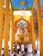 當我甫進廟時,就看見很多高棉族善在供奉的三座釋迦牟尼佛前虔誠又跪又叩又拜在祈福(右圖)。廟內一片莊嚴,壁上都是一幅幅佛陀由面世至成佛过程的圖像。而在佛像後面有一個佛腳印,聽說在這塊土地上種植什麼都不可以生長,所以後來用來建成了此廟。廟內地上四周有9個四方大坑,每個上面放著一個白色布袋,善信都把祈福品、金錢或黃金等掉進坑子去。以他們的習俗,想求什麼就得掉下什麼,