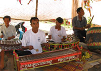 我再走到廟外,那裡搭了一個簡陋的棚子,由幾個高棉族人用該族特色的樂器(左圖),敲敲打打,叮叮咚咚,給整個的範圍空間增添了不少氣氛。另外有一個個棚子供奉著釋迦牟尼佛由面世至成佛過程的塑像。另一處是一行擺賣著很多東西和很多遊戲,這個情景,令我想起了約兩年前我曾赴蓄臻珠洋縣的Thum