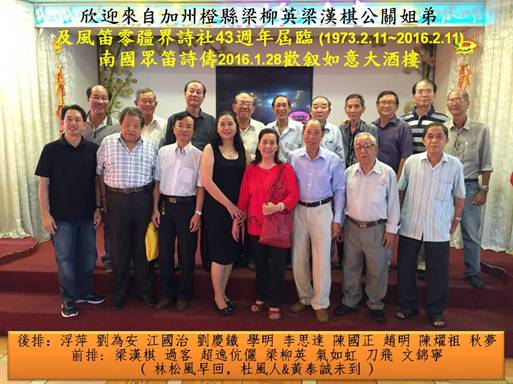 對!二零一六年一月廿八日星期四,風笛詩社的精彩時刻,梁柳英公關重歸故里探親,趁便邀請南國眾友聚會,荷野總編乘興提議,讓這聚會同時作為慶祝風笛詩社成立四十三週年。啊!假私濟公,加深意義,不同凡響,值得鼓掌!却有那麼湊巧,遇上越南全國黨大會隆重閉幕的日子,光輝政治照耀,我們的聚會就不須張掛什麼慶祝橫幅了。