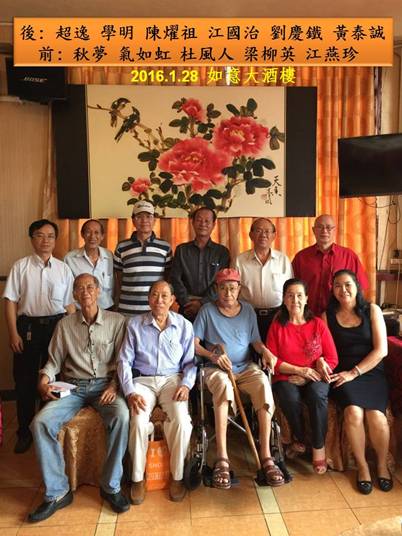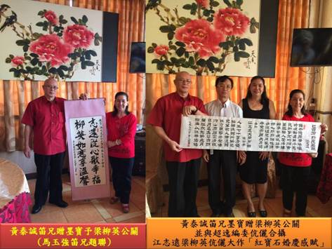 不經不覺過了十時,陳燿祖趕來歡聚,有些文友嚷着告辭,那機不可失,先來個大合照,走出富貴廳,在歌壇大禮台上,並列兩行拍攝。然後,好幾位文友告辭了,最後到來是杜風人和黃泰誠,巧的是兩位都是中醫師,曾經一度懸壺濟世,黃泰誠就是因為診治病人,才成為最後蒞臨,他帶來了書法墨寶,贈送主人,一副樸魯的對聯,兩首梁柳英伉儷的七律詩句,都是慶祝紅寶石婚,成為這個聚會的壓軸節目。