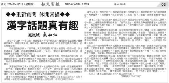 我從一字之缺,一字之差,意義變更,不可不慎說起;繼而談到電腦簡繁字體轉換的操作,容易出現差錯,應該留意。雖然簡單描述,也引起部份讀者的關注,內心感覺安慰。 有位朋友對我說:「怪不得上次我閱報讀到『鬥膽』的詞句,經你一提,我才知道那是『斗胆』的簡繁字體轉換所致。」又說:「牡丹紅劇本裡的幾個缺字。竟是扭轉全部意義,越想越有趣。」 的確,中國的方塊字,傳統上稱為漢字,真正很有趣。字的本身四平八穩,由圖畫般的象形、指事中演變而來,每個字都有其獨立的藝術性,何以會造成這個字,為什麼筆劃是這樣子,逐一研究,包管花費不少時間,而且趣味無窮,讓人樂在其中。 漢字由於形狀方塊,排列比較容易,上古時代的甲骨、金鼎,或進展到編蒲草,削竹筒,刻劃與書寫,都是由上而下,由右至左,直到發明印刷術,仍然沿襲這傳統的規則。近代則有所革新,受到西方拼音字母橫排所影響,漢字也跟隨轉變為橫行,加上電腦的應用程式,更要由左至右的橫排才方便操作。幸好,漢字有其特殊的優點,無論直書橫寫都可以,無論由右至左或由左向右,完全不成問題;甚至可以作圓圈擺放,循環閱讀,這是世界上任何文字所沒有的。 漢字個體獨立,每字一義或多義,串聯起來成為詞句,表達整體含意,標點符號的作用就很重要,不同的分句會產生不同的概念。民間通俗皆知的笑話:「路不通行不得在此小便」,就是最佳例子。 漢字又是逐一相加的組合,有時疏忽顛倒,令意義全非。傳說慈禧太后批示某將軍請辭,幕僚書冩:「將軍雖老,然下部可用!」竟把「部下」倒置,老將軍被嚇得一身冷汗。 漢字又可上下左右閱讀,橫排尤須小心,措詞造句必要再三推敲,以免令人誤解。老一輩人士會聽過豬鬃牙刷的廣告;「包不脫毛」,結果被用户投訴質量差,生產商狡辯:「我已聲明毛脫不包呀」!「倫敦日本」,地方專有名詞,由右向左變成「本日敦倫」,今天做愛啦! 還有一些差錯是造句措詞不當,在相連的字裡行間會發生了疑義,在每日報紙的新聞報導,編者命題急速,更須謹慎。譬如有則新聞這樣大字標題:「國營店生意低落,私人性交易提高」,裡面的「私人性交」就特別礙眼。又有篇勸世文章,規勸「做人要具備勇氣,富有創造性生活。」是「創造性」生活,還是創造「性生活」?香港有一首粵語流行歌曲,《願妳今夜別離去》,既可解釋:別(不要)「離去」,也可當作「別離」去吧! 在以上的一連串簡單擧例,就看到漢字的豐富多姿,趣味無窮。其實還有更多的有趣話題,比如同是漢字,在民間各種方言的運用上也發生差別,就以潮語和粵語比較一下,潮語的「打炮」是燒爆竹,「鹹濕」是吝嗇;粵語却含貶義,不雅,「打炮」指男性跟女性做愛,「鹹濕」是指有淫穢色情的意念。 古代漢字流傳到越日韓三國,也發展出一些不同的使用方式,翻譯必須留意,如果根據中國漢字的正常解釋,那就大錯特錯。譬如越南語的「下賤」,不是下流賤格,而是吝嗇;「包皮」,不是男性陽具的皮層,而是指包裝物件的箱盒。「擒」不是捕捉,而是拿取,「曰」不是說,而是寫,如此種種,不勝枚舉。日文也一樣,說起「寫真」 ,是我們的攝影,「無料」,是我們的免費,以前在越南放映一齣日本電影《手槍》,銀幕出現的漢字却是「拳銃」。韓語我所知不多,據說其含意與漢語的意思更是明顯不同,漢語的「以身作則」,韓式漢語是「率先垂範」,而「工作」變成「勤務」……。 太多了,漢字話題永遠說不完,真的非常有趣。
