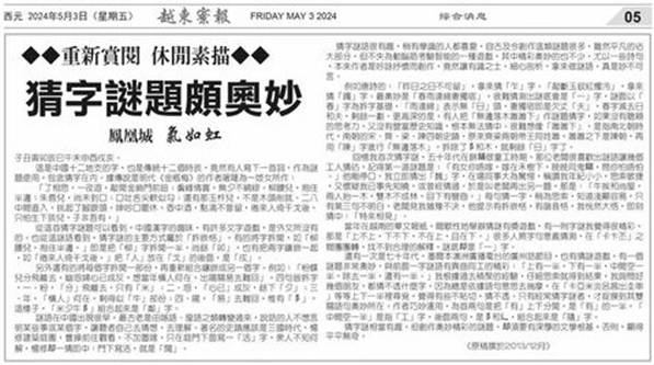 子丑寅卯辰巳午未申酉戌亥。 這是中國十二地支的字,也是傳統十二個時辰,竟然有人寫下一首詞,作為謎題使 用,包含猜字在內。據傳說是明代《金瓶梅》的作者屠隆為一妓女所作: 「了相思,一夜遊,敲開金鎖門前鈕;夤緣情竇,無夕不綢繆。柳腰兒,抱住半邊;朱唇兒,尚未到口;口吐舌尖軟似勾;還有那玉杵兒,不是木頭削就。二八中間直入,挑起了腳跟頭,呻吟口罷休,壺中酒,點滴不曾留,倦來人倚干戈後,只怕生下孩兒,子非吾有,」 從這首猜字謎題可以看到,中國漢字的趣味,有許多文字遊戲,是外文所沒有的。也從這謎語看到,猜字謎的主要方式屬於「拆嵌格」,有的將字拆開,如「柳腰兒,抱住半邊,」即是把「柳」字拆開一半,尚餘「卯」,也有把兩字鑲嵌一起,如「倦來人倚干戈後,」把「人」放在「戈」的後面,是「戌」。 另外還有的將每個字拆開一部份,再重新組合鑲嵌成另一個字。例如:「粉蝶兒分飛離去,幽怨婦心已成灰,想當年橫人何在,出陽關易去難回」,四句皆拆字,一、粉,「分」飛離去,只有「米」;二、怨,「心已」成灰,餘下「夕」;三、年,「橫人」何在,剩得似「牛」部份;四、陽,「易」去難回,惟有「阝」,這樣子,「米夕牛阝」組合起來是「鄰」字。 謎語在中國出現很早,最古老是由隱語、廋語之類轉變過來,說話的人不想言明某些事或某個字,讓聽者自己去猜想,去理解。著名的史蹟應該是三國時代,楊修建築庭園,曹操前往觀看,不加置喙,只在庭門下面寫一「活」字,眾人不知何解,楊修却一猜即中:門下寫活,就是「闊」。 猜字謎語很有趣,稍有學識的人都喜愛,自古及今創作這類謎題很多,雖然平凡的佔大部分,但不失為動腦筋考驗智能的一種遊戲,其中精彩奧妙的也不少,尤以一些詩句,本來作者是吟詠抒懷而創作,竟然讓有識之士,細心剖析,拿來做謎語,真是妙不可言。 例如唐詩的:「昨日之日不可留」,拿來猜「乍」字。「敲斷玉釵紅燭冷」,拿來猜「鐲」字。最奧妙是「春雨連綿妻獨宿」,很難猜測出謎底會是「一」字,謎面以「春」字為拆字基礎,「雨連綿」表示無「日」頭,妻獨宿即是欠丈「夫」,春字減去日和夫,剩餘一劃。更高深的是,有人把「無邊落木蕭蕭下」作謎題猜字,如果沒有聰穎的思考力,又沒有豐富歷史知識,根本無法猜中。很難想像「蕭蕭下」,是指南北朝時代,南朝的宋、齊、梁、陳四朝史蹟,原來齊梁兩朝帝王同姓蕭,蕭蕭之下是陳朝,再用「陳」字進行「無邊落木」,拆除了阝和木,就剩餘「日」字了。 回憶我首次猜字謎,五十年代在餅舗做童工時期,那位老闆很喜歡出謎語讓幾個工人猜估,記得第一道謎題是;「有女你唔嫁,嫁在禾樹下,晚晚同鬼瞓,問你怕唔怕。」他剛停口,我立即猜出「魏」字,在場同事大為驚愕,稱讚我年紀小小,思索敏捷,又懷疑我已事先知曉,或曾經猜過。於是叫老闆再出另一題,那是:「牛挨和尚屋,兩人抬一木,雙木不成林,目下有彎曲。」每句猜一字,稍為思索,知道淺顯容易,只有第三句不明白,老闆見我猶豫不決,他提示有拆嵌格,有諧音格,我恍然大悟,即刻猜中:「特來相見」。 當年在越南的華文報紙,間歇性地舉辦猜謎有獎遊戲,有一則字謎我覺得很精彩,那是「上不上,下不下,不在上,且在下。」很多人照字句意義猜測,在「卡卞丕」之間團團轉,找不到合理的解釋,謎底却是「一」字。 還有一次是七十年代,墨爾本澳洲廣播電台的廣州話節目,也有猜謎遊戲,有一個謎題非常奧妙,與前面一字謎語有異曲同工的精彩:「上有一半,下有一半,中間空一半,除去一半,還有一半。」我根據過去積聚的經驗,仔細思索就得到結果,我詢問好幾個朋友,都猜不透什麼字,因為總是依據語句意思去揣摩,在「卡亞米炎呂昌出圭串」等等上下一半裡尋覓,覺得有些不貼切,猜不透。只有經常猜字謎者,才捉摸到其雙關語句奧妙所在。作者巧妙運用,為首兩句是把「有」上下分開,是「有」的一半,「中間空一半」是指「工」字,後面兩句,是阝和辶,組合起來是「隨」字。 猜字謎相當有趣,但創作奧妙精彩的謎題,却須要有深厚的文學根基,否則,顯得平平無奇。