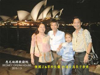 (一) 於2015年元旦(歲次甲午十一月十一日)又一個機緣,讓我在人生旅途中再裝飾一個美夢,點燃一次亮麗的行程──澳洲之旅。 當晚九點乘搭越航VN 773直飛澳洲悉尼市Sydney。翌日元月二月星期五早上九點半,飛機降落澳大利亞悉尼國際機場,悉尼市的富球旅遊公司總經理莊豐成先生親自來接機,並送我們四人(我和內子翠珍,長子敦堯及內孫女)到距中國城步行約十五分鐘的一間三星旅店ASPIRE HOTEL。辦理登記手續後,隨即帶引我們家人到唐人街逛商店(藉以證明旅店離中國城不遠),最後介紹我們到一間大商場MARKET CITY三樓的餐飲區用膳,之後揮別,確實莊先生接待顧客非常熱誠、週到。 本來赴悉尼之前幾天,我和一位老同學梁少梅與其丈夫林耀才兄在電話中約定元月二日晚六點在旅店會面,之後大家同去用晚膳。但當我們在MATKET剛用完午飯時,少梅給我一個意外的驚喜,她突然出現在我眼前,真是出人意表。原來耀才兄和莊豐成先生本是老友,所以要耀才兄從莊先生得悉我們用午飯地點而到來,還有在商場樓下,由於泊車不方便,坐在車上等待的耀才兄之外,還有天涯闊別,已卅年不相見的劉安寧表弟。 於是大夥兒一齊回我下榻的旅店房間,一番寒暄,彼此冰封了多年的感情得以解凍,尤其安寧表弟這個老表之情都快長出了青苔。那年,一個荒涼的揮手,就揮別了數十年。猶憶當年,我和少梅、安寧都是同校,我們的青春都已捐給戰火,如今,大家的鬢髮斑白,尤其安寧表弟已是半個禿頭老人了。頓時,讓我想起2010年在巴黎追夢時,曾與隔別廿年的王明洋、明海、明河、秀梅等各表弟妹們相聚,如今,在悉尼與安寧相聚,我不知道這是不是所謂緣份。 要說的舊事太多了,那時已是下午三點了,他們告辭,大家相約當晚六點再餐聚。 當晚六點,少梅一個先到,耀才兄稍後才來,她帶我們漫步悉尼市中心唐人街,在這裡讓我體驗此地華人生活的聲色風情,尤其當晚適逢每週星期五,這兒的一條步行街DIXON Street才有擺賣夜市的各攤檔,擺賣各式燒烤食品、紀念品、服裝……營業至深宵,遊人如鯽,非常熱鬧,好比香港的廟街,此唐人街的喧鬧是充滿感情的律動;而且別致的,是這條步行街的街道兩頭都建有龍門牌坊,牌匾上以金色題字:“四海一家”和“通德履信”,富有東方傳統文化之美。 約七點,耀才兄來電,他已在唐人街一間華人“八樂居”大酒樓等候我們。 席間,大家一面品嚐美味的佳餚,一面細訴彼此戰後餘生的人生歷程,曾經一段日子大家走過荒涼,如今,歲月的皺紋都爬滿額上……。