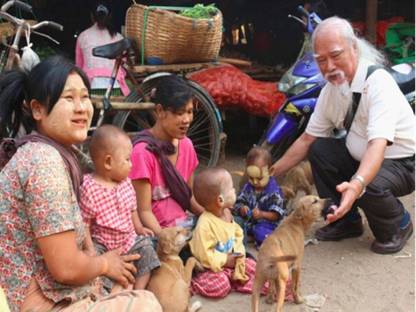 馬來西亞詩人吳岸在慰問貧困的小孩。(照片轉載自林曉東)