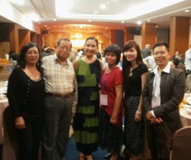 2013年12月7日中午,不管友鄰政局風雲變幻,我們越南團一行五人還是如期到了泰國浪漫之都參加東南亞詩人筆會第七屆大會。我身體狀況一年不如一年,在團友勸說下,不得已要帶太太同行。大會組委會安排前舞蹈演員、現任建築行老闆孔屏小姐接機。她的名字,令人聯想“孔雀開屏”(下圖,左三)。