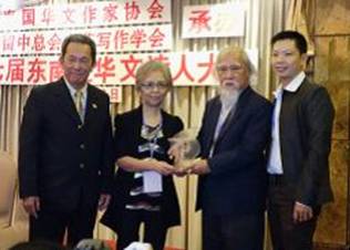 從曼谷舊機場(Don Muang)回到下榻酒店三十多公里,一路空空蕩蕩,跟我想像中的黃衫軍阻塞街道完全兩樣。孔小姐開玩笑說:“大概他們知道你們來了,特別為之清道”。我回答:“今天星期六,遊行隊伍也是要休假的”。 帝日酒店披上了節日的盛裝,迎接來自東盟八國(除了柬埔寨和老撾)詩人及中、臺嘉賓陸續到來。我這個人可健忘,經林小東、鍾靈的提醒,才認得吳岸、郭永秀、秋山、曾心、王濤、旭陽、心受、孫德安等十來張老面孔。 八日上午九時,大會隆重開幕。到會代表一百多人,盛況空前。簡單的開幕式過後,中國駐泰大使館僑務參贊方文國已詩一般的語言致賀詞,他說:“詩人是繆斯的愛徒,也是歷史的記錄者、時代的歌手……用詩歌的語言歌頌對東南亞這片美麗土地的熱愛,對當地人民給予幫助的感激,對故國與家鄉的思念,對美好未來的期盼”。 孫德安常務理事代表筆會在致辭中追溯2006年,汶萊、馬來西亞、新加坡、菲律賓、泰國、印尼等六國的14位詩人在中國福州市會面,發起組織“東南亞詩人筆會”。以後每年一屆大會,至今已是第七屆;其中第三屆在越南胡志明市舉辦。他說:“我們相聚在此,是溝通,是對話,交流感情,增進共識,欣賞詩歌,享受詩歌,重溫詩歌的榮光,使詩歌提高心靈的健康,提高生活的素質,提高心靈的高貴”。 致辭完畢,由筆會三位常務理事吳岸、林小東、孫德安向已故菲律賓詩人、筆會創始者之一雲鶴先生的遺孀秋笛女詩人頒發銀盾,刻鏤“雲鶴飛翔、綿延不息”,以表彰他對筆會卓越的貢獻。