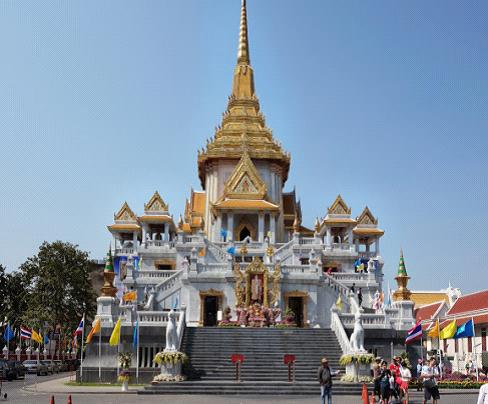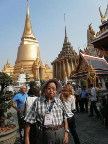 1768年,鄭信驅逐緬甸侵略軍,統一泰國全境,建立吞武里王朝。鄭王派大將拉瑪征服老撾,佔領上寮,把玉佛請回吞武里奉祀。1783年,拉瑪殺害鄭信,建立拉瑪王朝,定都曼谷,建玉佛寺奉祀至今。難道玉佛從天而降?無從考據。 1991年,爲了紀念王后生日,清萊府政府在加拿大購買一塊大翡翠,運到北京加工成跟原版玉佛一模一樣的玉佛,在舊址建廟供奉。清萊玉佛廟就在市政廳山腳下。 金佛寺——泰國華人之光 一天下午開會有空擋,團友忙著購物。我閒著無聊,詢問酒店柜臺後,徒步轉了兩個街角,在鬧市中的一座廟宇使我眼前一亮。寺院規模不大,但氣勢磅礴(下圖)。寺內供奉一尊世界最大的金佛,高四米,純金打造,重5.5噸(下圖,菲律賓詩人柳夢影提供)。最令我吃驚的是,價值連城的寶物,居然沒有一點防範措施;要是安放在越南,它早就被肢解。我問寺廟住持,他回答,泰國人一生勞碌,最大願望是積攢點兒黃金還願寺廟;雞鳴狗盜之徒,即使再給他一個膽子,也不敢光顧寺廟。