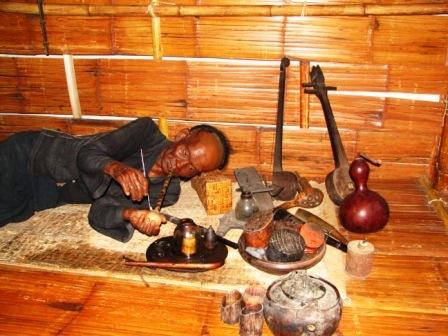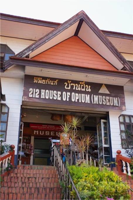 展示告訴我們,發現鴉片“居功”至偉是17世紀一名英國醫生,他發現罌粟果皮的汁液有強大的收斂、止痛和鎮定作用。罌粟不僅用來治病,人們還隨意添加到咖啡、糖果,以產生飄飄欲仙的感覺。鴉片成了中英鴉片戰爭的導火索。連環油畫顯示,1848年3月6日,兩廣總督林則徐在廣州虎門焚燒英商的120萬兩鴉片,大火足足燒了20天。 展示也體現了泰國在消滅毒品所作的努力:詩納卡琳皇太后(1900——1995)曾多次到金三角鼓勵居民種植經濟作物替代罌粟;前總理他信也到這裡坐鎮剿滅毒品。博物館重現了金三角從鼎盛到衰亡的歷史,以及多位“鴉片將軍”的發家史。 這個博物館也十分怪異,不僅展示金三角毒品的黃金牌號,以及寫“Opion”(鴉片)字樣的T恤,好像在給它作免費廣告;還出售煙燈、煙槍、煙盒、天平——雖然都是仿製品,但容易引起煙民的懷舊。