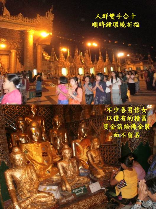 仰光還有景色秀麗的“皇家湖”,湖面鋪架一條1.5公里的棧橋,遊客一邊在橋上漫步,一邊欣賞景色。棧橋末端是昂山公園,公園內有昂山將軍雕像(上圖),活靈活現,好像在慷慨陳詞,宣揚他的理想。 昂山將軍是昂山素姬之父,曾率領“緬甸獨立同盟軍”,在日本投降前就解放了仰光,得到緬甸人民推崇為“國父”。1947年,在緬甸獨立前夕,他被右翼勢力刺殺,年僅32歲。 夜色中燦爛的大金塔 大金塔是仰光的地標,也是緬甸人的驕傲。不論站在仰光的那一個街角,都可以仰望大金塔,但只當夜幕垂下,萬燈照耀,才更能顯耀它迷人的英姿。 緬甸人相信腳板最為不潔(?),因而進入寺廟台階要把鞋襪脫光。美國奧巴馬總統和國務卿希拉里2012年首次訪緬,參拜大金寺時也成了“赤腳大仙”。我圖個方便,一路穿涼鞋;緬甸人個個穿人字拖鞋,入廟禮佛時更為方便。 我隨團乘電梯登上大金寺大理石鋪設的平台,立即被64座金光閃閃的寶塔雄偉的氣勢所震懾。塔群主體是大金塔,通體貼金7噸,連所有寶塔都算上,“含金量”高達60噸。大金塔頂有一面純金打造的寶幡,鑲嵌5450顆鑽石,最大一顆54卡拉。塔檐鑲紅寶石、翡翠、藍玉不計其數。 大金寺“鎮寺之寶”是釋迦牟尼的八根頭髮,除此以外還有拘留孫的拐杖、迦葉的袈裟一角、拘那含的濾水瓶。據傳,佛祖在菩提樹下悟成大道,託兩位孟族商人把他的八根頭髮舍利帶回緬甸,緬甸人就建塔供奉。這麼說來大金塔至少有2500年歷史,緬甸還在混沌洪荒;據考古學家考證,大金寺始建於第六世紀,第十世紀完成,大金塔“金身”則是十五世紀孟族女皇完成。 我隨著人群雙手合十,順時鐘環繞祈福(下圖),見到不少善男信女以僅有的積蓄買金箔給佛金裝而不留下姓名(下圖),我才明白為什麼這個東南亞最貧窮的國家寺廟裡卻“遍地黃金”。這件事啟發了我的深思:國家資源都貼上佛像,哪裡來資金發展經濟?人人潛心修行,沒有發家致富的強烈願望,經濟發展也就喪失了動力。 根據阮麟勇教授提供的資料,2004年印度洋大海嘯,緬甸13萬人罹難,“大金塔成塊金磚被剝落,人們重拾這些碎片,重貼金身,結果是一塊也沒少”。緬甸小偷絕跡,佛教引導心靈向善,功不可沒。 次日,筆會成員繼續北上蒲甘和曼德勒,繼續佛國探索之旅。