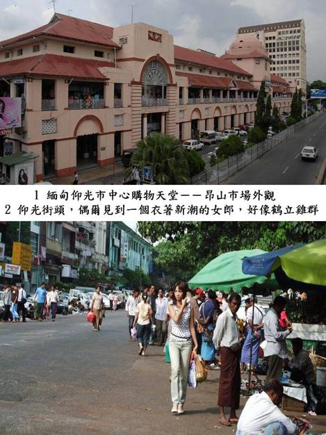 仰光街頭,偶爾見到一個衣著新潮的女郎,好像鶴立雞群(圖2)。