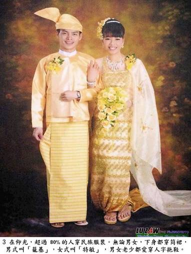 緬甸是一個傳統文化保存得非常好的國家,在仰光,超過80%的人穿民族服裝。無論男女,下身都穿筒裙,男式叫“籠基”,女式叫“特敏”,類似馬來人的紗籠。男女穿法不一樣,男式的籠基是在腰際打一個結,這個結打得很隨便,常常要在眾目睽睽之下鬆開再綁實,頗不雅觀,如廁也不方便。男人上衣為無領對襟長袖短衫,或T恤,用一條或粉紅或黃或白的薄紗或絲綢帕包在頭上,作為出席盛會的禮帽。我在仰光見到緬甸男子,不論的士司機、路邊攤小販、泥水匠、甚至踢街道足球的青少年,都穿拖泥帶水的籠基。
