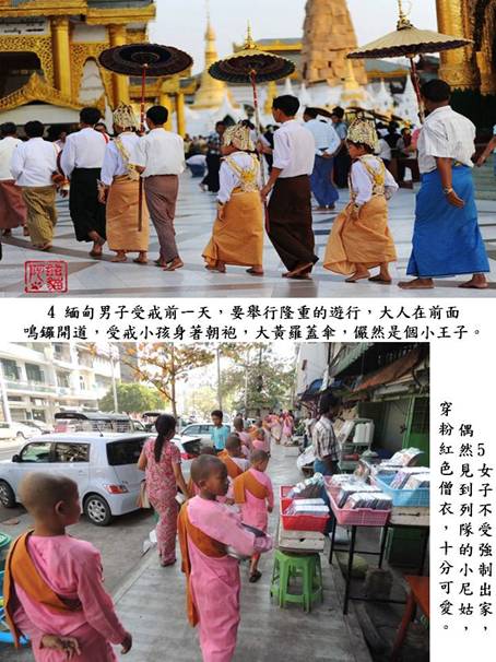 出家年齡為十歲,修行期為一、二、三年不等;佛渡有緣人,可以長久修行下去。現在只象徵性地修行七天,返回世俗後才能娶妻生子。女子不受強制出家,偶然見到列隊的小尼姑,穿粉紅色僧衣,十分可愛(圖5)。