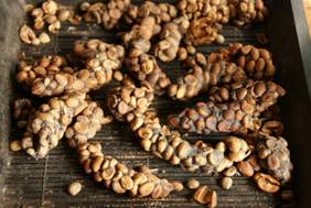 果子狸雖然愛吃咖啡果,但只吃掛在枝頭的新鮮果子(下圖)。啡農採摘時,半生不熟的果實一起採再藏熟,隔夜的咖啡果,果子狸是不吃的;因此,西貢近郊的果子狸養殖戶無法生產貍香咖啡。