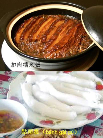 先安人生活節奏似乎慢了半拍,我來時已經九點多,還有不少人在喝咖啡閒磕牙。我驚奇地發現,當地早餐竟然有久違的扣肉糯米飯。儘管已在下龍市進了早點,我還是要來一碗大快朵頤。扣肉是華人的捋手小菜,小販學自當地山瑤族同胞,已經是二傳弟子,但味道還差強人意。扣肉已成先安招攬遊客的招牌菜,能上廳堂,能下廚房(圖2)。在胡志明市,這道菜稍嫌油膩,除了客家料理,已不多見。