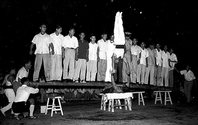 演出地點是位於芒街街的利舞台,是當時最大的戲院,可容納一千人,演話劇和大戲。王邦夫表演肌肉秀、砸大石、汽車碾人、腹上鋪木板站立20人(下圖,多倫多潘兆偉校友供稿,倒立者為王邦民)等節目;王邦民則耍雜技、小丑打諢。我在後台看得一清二楚,王邦夫的節目都是貨真價實,只有壓軸戲“鬥牛”則不敢恭維。不同於西班牙鬥牛,王邦夫“鬥”的是一頭餓了兩天的黃牛,毫無鬥志,乖乖地聽憑“大力士”把它絆倒。
