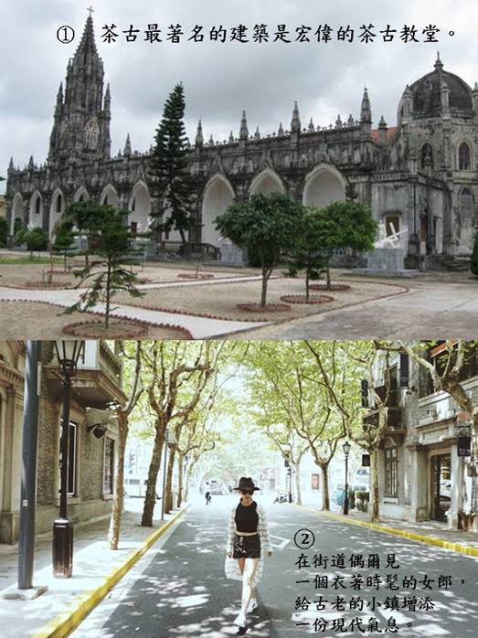 茶古有很多法國建築,在街道偶爾見到一個衣著時髦的女郎,給古老的小鎮增添一份現代氣息(圖②)。