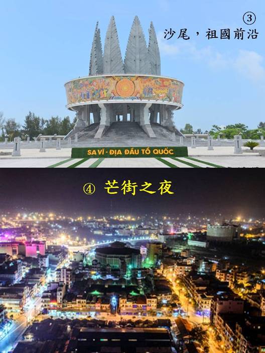 茶古海灘長17公里,是越南最長的海灘。進入沙尾,映入我眼簾是一座高27米的雕刻,取意於長滿海灘的山毛櫸,中部是直徑16米的環狀拼磁畫,就像束了條腰帶,底部是“沙尾,祖國前沿”一行大字(圖③)。沙尾是一塊伸入大海的沙地,和中國的“京族三村”隔海相望,現已闢作公園。