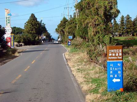 從濟州市沿526國道走4公里,離大名鼎鼎的“愛情公園”一公里,有一條不起眼的斜坡,名為“神秘道路”(下圖)。坡長只有100米,但好像地心吸引力弄錯了方向,令得“水往高處流”。