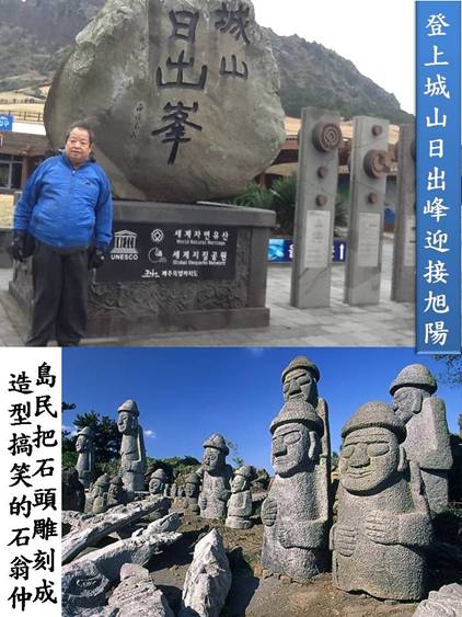 濟州島是火山熔岩冷卻形成,島上到處是石頭。島上傳統石屋,就是用這種石頭堆砌的。島民還把石頭雕刻成造型搞笑的石翁仲(圖a下),是原始居民的圖騰。石頭屬玄武岩、烏黑發亮、多孔、浮於水。我買了一塊石頭想作鎮紙用,但電腦時代,無紙可鎮。聽說“今日知識”雜誌總編韓晉光先生有收集奇石的癖好,就轉送給了他。