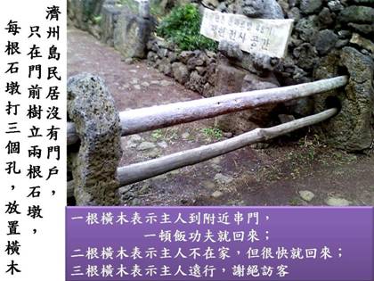 濟州島民居沒有門戶,只在門前樹立兩根石墩,每根石墩打三個孔,放置橫木。一根橫木表示主人到附近串門,一頓飯功夫就回來;二根橫木表示主人不在家,但很快就回來;三根橫木表示主人遠行,謝絕訪客(圖b)。今天,濟州道已設置濟州、浦歸西二市,高樓大廈鱗次櫛比,“小國寡民”上古遺風又能維持到幾時?