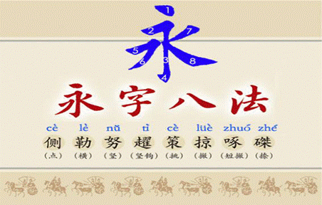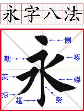 有些人認為學英語、法語,只用記住24個字母就行(!)。按這個邏輯,八萬多個漢字不過由八種基本筆法構成,那就是“永字八法”(下圖),學一個“永”字就行了,豈不更簡單?