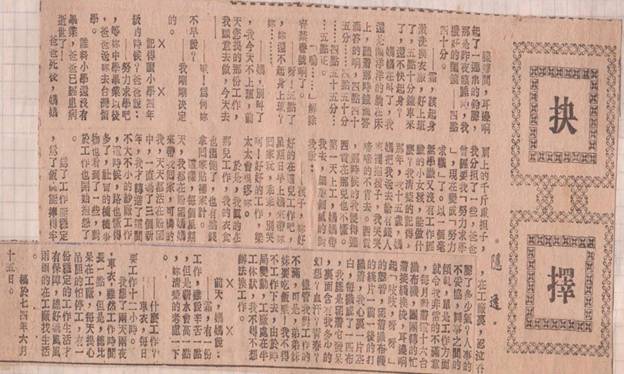 這樣每個星期天,我都在盼望媽媽來帶我回家,可憐的我,天天都活在盼望中,一直過了三個新年,我才轉進了這間不大不小的紡織廠工作,這時候,路也懂得多了,社會的種種事物也看多了,對於工作也開始抱怨了。