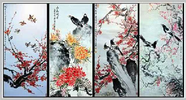 春季畫的是桃花盛開,兩個黃鸝停在樹枝上鳴唱;夏季畫的是池塘荷花,一雙鴛鴦在荷葉旁戲水;秋季畫的是金桂飄香,一對畫眉相對而視;冬季畫的是臘梅綻放,兩隻白頭翁偎依在一起。