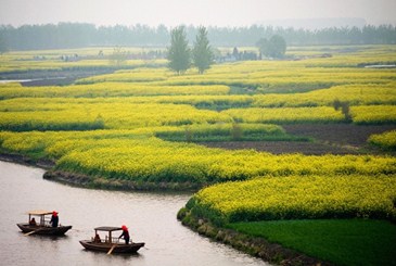 紅巾棹婦小舟撑 遍野金黄亮眼呈