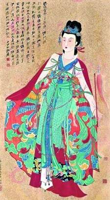 手持紅拂影駢娟 花彩披篷欹瘦肩 雲鬢步揺神繾綣 羅裙珠曳縷蟬嫣 英雄逆旅恥驕貴 歌女私奔棄翠鈿 技法敦煌留貴紙 傳奇千古畫圖妍