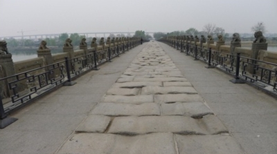 近在《風笛詩社》網上,先後讀得南京陳永昌及越南向華強二詩家歌詠盧溝橋詩章,余於2012年四月春明旅遊,於橋上過走勾留,在橋之兩端覽景,宛平城門一端,有康熙御筆「盧溝曉月」碑。橋之另一端有「古渡千秋」碑,為1992年9月10日盧溝橋修繕暨建成八百週年碑。北京人有諺云:「盧溝橋上石獅子」,意即數不清也。據云上世紀60年代初,北京文物工作者指出石獅共485隻,陳永昌先生詩云: