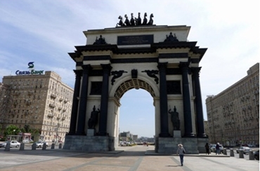莫斯科凱旋門在莫斯科西邊的繁忙大街中央,與巴黎凱旋門相似,但規模略小。讓人思索者,這兩座凱旋門都是為了紀念同一戰爭而建。1812年,拿破侖率領64萬大軍攻進莫斯科,火燒城池,他以為勝利了。但莫斯科軍民在拿破侖撤離途中頻頻出擊,時天寒地凍,糧草不繼,法軍傷亡慘重。俄軍也稱勝利了。