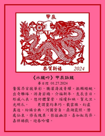 奮髯昂首披華彩,騰濯濤波青耀。振鱗蜲蜿,出奇雕琢,游身若矯。介福新年,良辰吉日,形威八表。想紆體鞶縈,瑶瓊和映,賀元旦、光明爪。