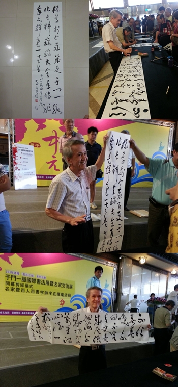 是日應邀參加台灣書法之都基隆市「基隆書法學會」舉辦的「于門一脈國際書法展」;本展係為紀念于右任先生逝世五十週年而辦,所有作品均係承傳于右任先生標準草書的四大弟子(胡公石、劉延濤、李普同、金澤子卿)和學會會員,包括台灣「中國標準草書學會」、「南京標準草書社」、日本「高崎書道會」和韓國書法會等的作品,數月前已在南京和日本東京巡迴展過,是次移至台灣展出。筆者除提供作品一幅參展外,昨再受邀參加開幕典禮,並應現場觀眾要求即席揮毫數幅,且臨時靈感作此詩即興。