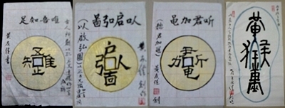 听君加黾我聆傳 古訓新詞一再研 恭喜發才財始發 年豐人壽慶齊肩 註: 圖1:「唯吾知足」乃古人所創以銅錢孔方兄中之方口綴成四字成語勉人莫貪。 圖2:「以启弘啚」係我新創之孔方兄四字成語。 圖3:「听君加黾」亦係我新創之孔方兄四字成語。 圖4:係我新創之以藍白拖鞋中之人字形夾趾帶綴成「黃金萬兩猴」作猴年祝詞春聯。